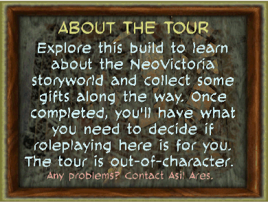 The physical constructions in NeoVictoria uses a Steampunk aesthetic and echos many of the themes found in the writings of Charles Dickens. Steampunk is a sub-genre of fantasy and speculative fiction that denotes works set in an era where steam power is still widely used ~think Victorian England~ but with prominent elements of fantasy or science and a lot less "stuffiness". It could be the "Time Machine" found in the works of H. G. Wells or real technological developments (like the computer) occurring at an earlier date. In this alternate experience of our earth's history, the fae and the other supernaturals never faded and Queen Victoria still sits on a throne with an empire that spans the universe. Our world is the planet "NeoVictoria" in the galaxy "VICO III" and the year is 2127.